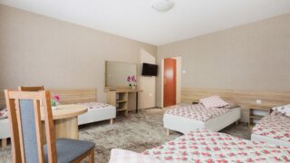 6 noclegów w pokojach 3 – 6 osobowych z pełnym węzłem sanitarnym .